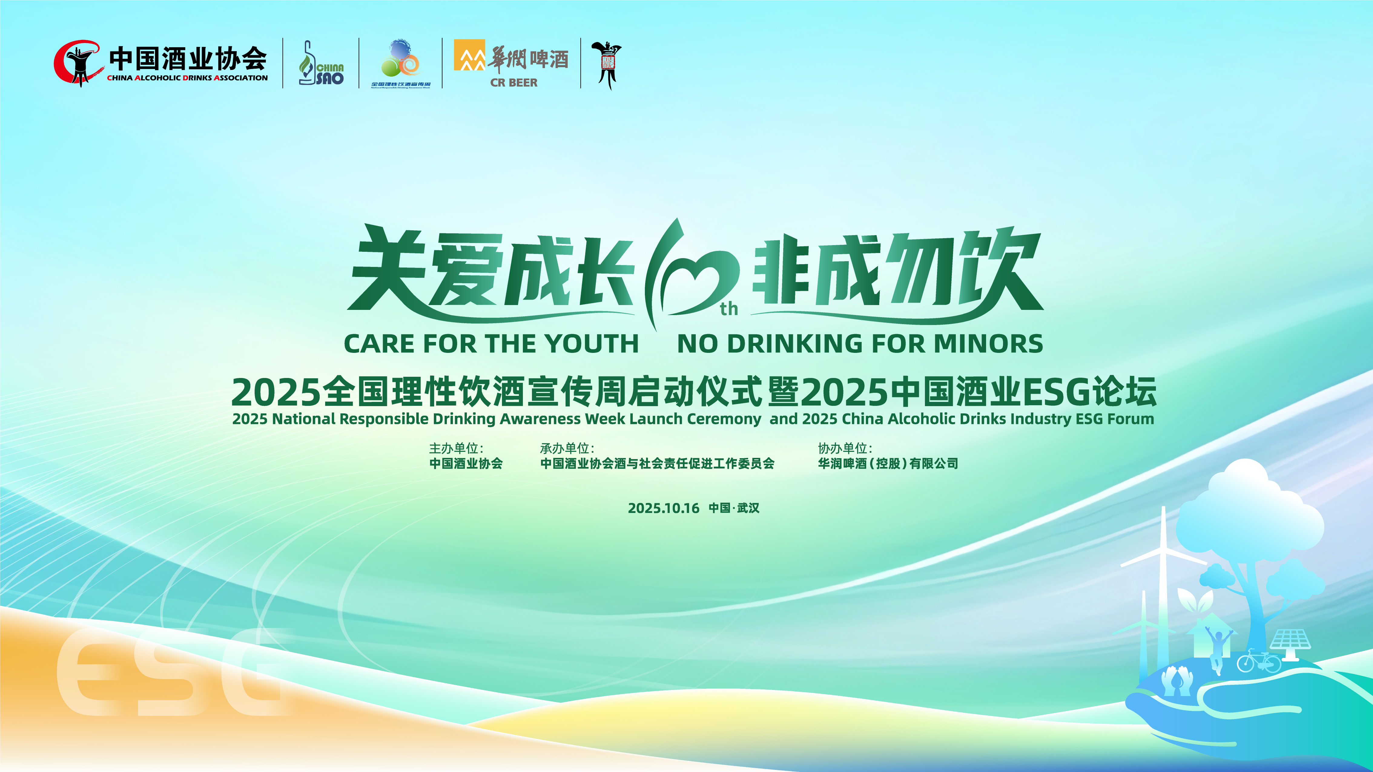 2025年10月16日下午,由中国酒业协会主办、酒与社会责任促进工作委员会承办、华润啤酒(控股)有限公司协办的“关爱成长、非成勿饮”2025全国理性饮酒宣传周启动仪式暨2025中国酒业ESG论坛在武汉“关爱成长、非成勿饮”2025全国理性饮酒宣传周启动仪式暨2025中国酒业ESG论坛盛大举行