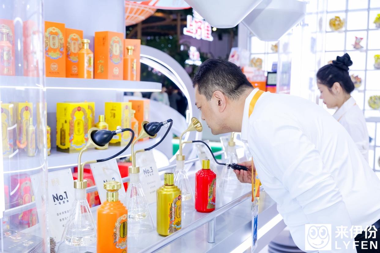 为匹配平台化战略,来伊份展台以“品牌宇宙”为核心设计理念,通过流线型动线与场景化布局,构建沉浸式体验空间。智能机械臂打卡装置、专业级威士忌和酱香白酒闻香品鉴区,以及现磨咖啡和新鲜零食的试饮试吃相结合,实现了从商品展示到情感交互的体验升级。