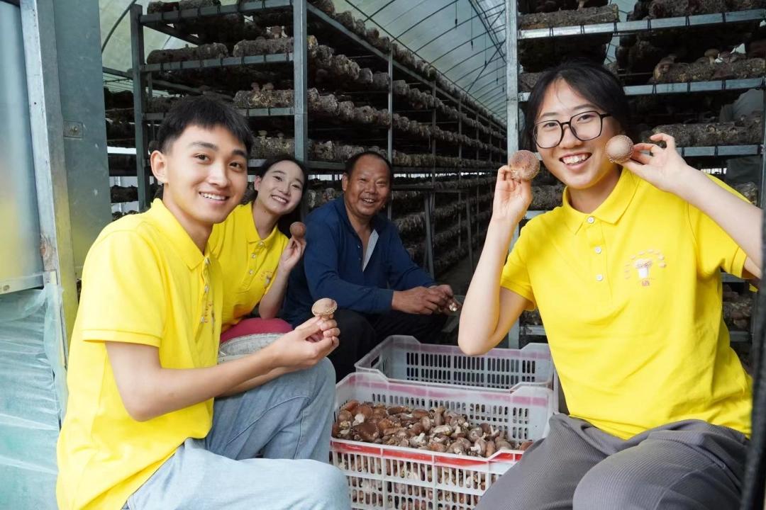 袁尊溢(左二)和“‘硒’望无限”团队成员在道真茅台帮扶园实地跟踪酒糟菌棒生长情况(受访者供图)
