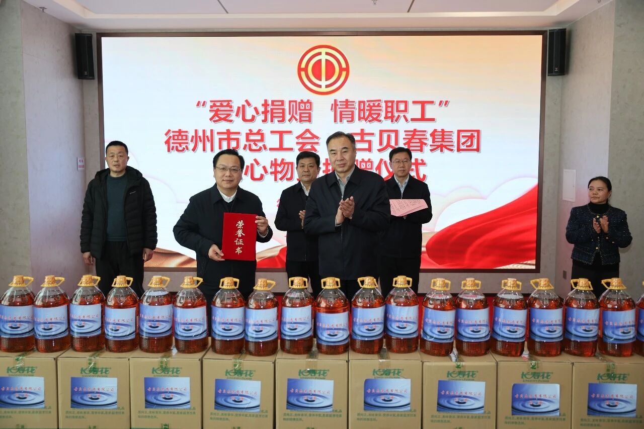 仪式上,古贝春集团党委副书记、总经理张洪昌代表公司向德州市困难职工代表捐赠食用油500桶,市总工会副主席温福顺代表困难职工接受捐赠,并为公司颁发捐赠荣誉证书。