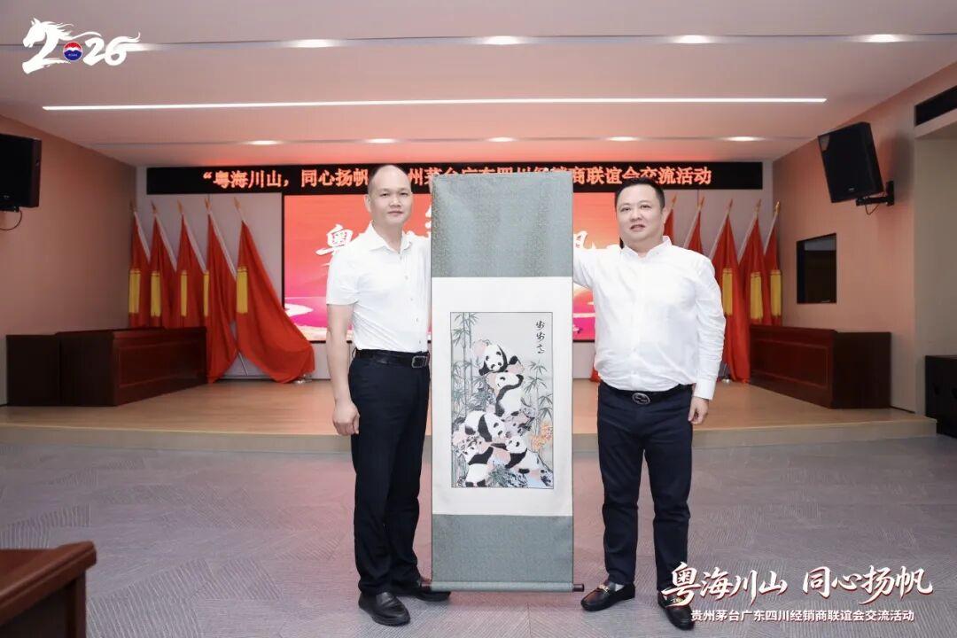 交流会上,川粤经销商联谊会会长互赠纪念礼品,定格深厚情谊。